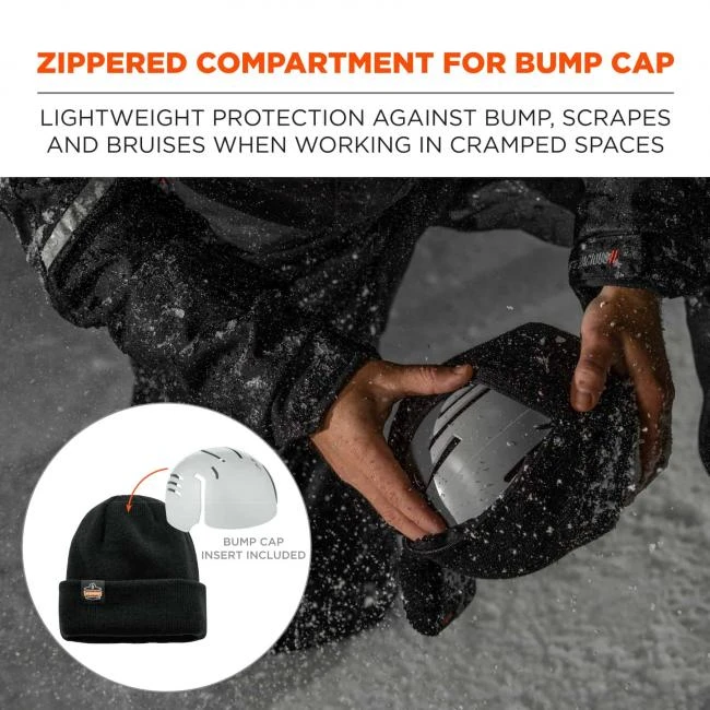 The N-Ferno® 6811ZI Zippered Rib Knit Beanie Hat with Bump Cap Insert provides warmth, as well as lightweight protection from bumps, scrapes, bruises and other minor head injuries. Wear this soft cuffed beanie alone or open the back zippered compartment to add the 8945 Universal Bump Cap Insert (included) for work in cramped spaces. Made with 100% soft dry acrylic and 40-gram 3M flex stretch insulation for a warm, comfortable fit.